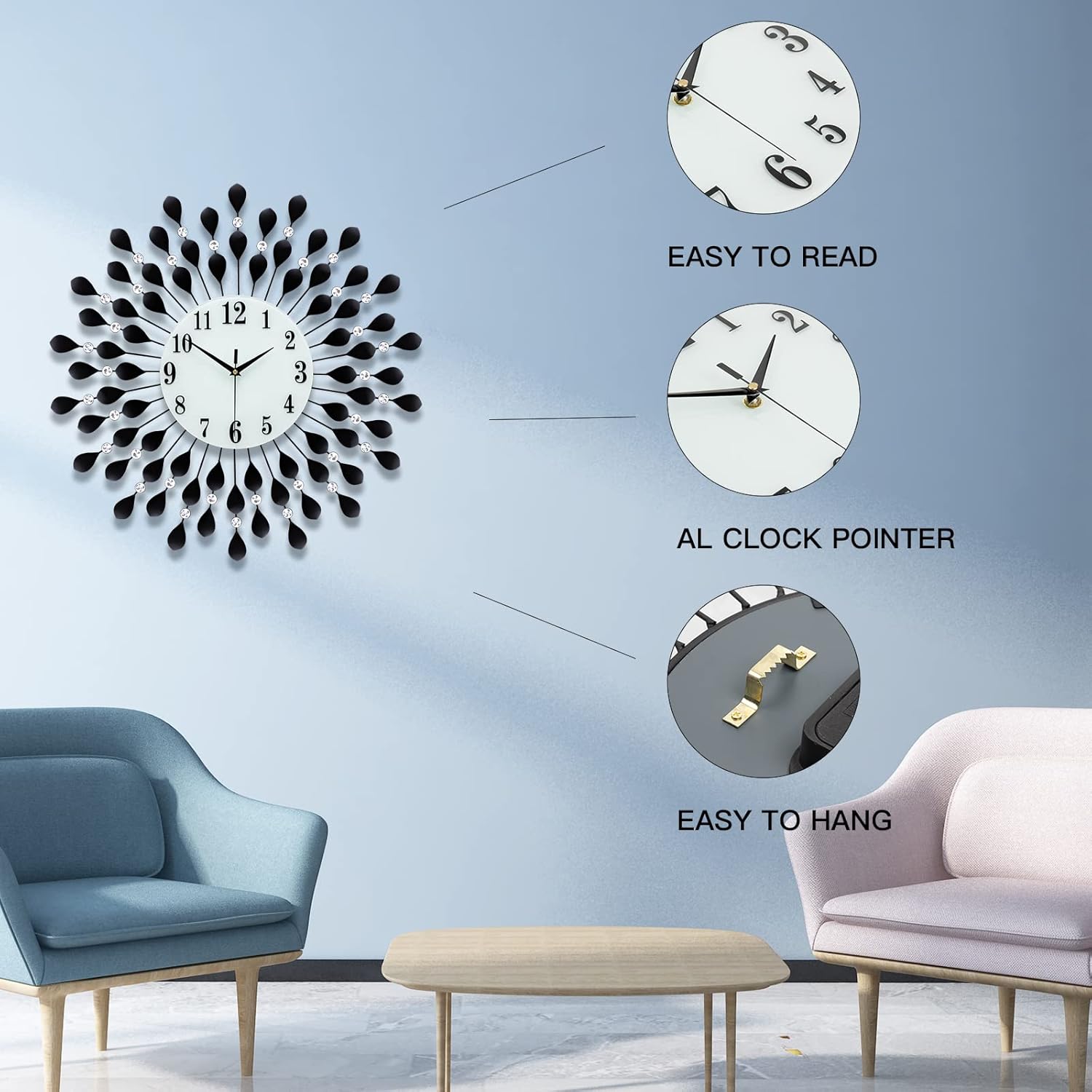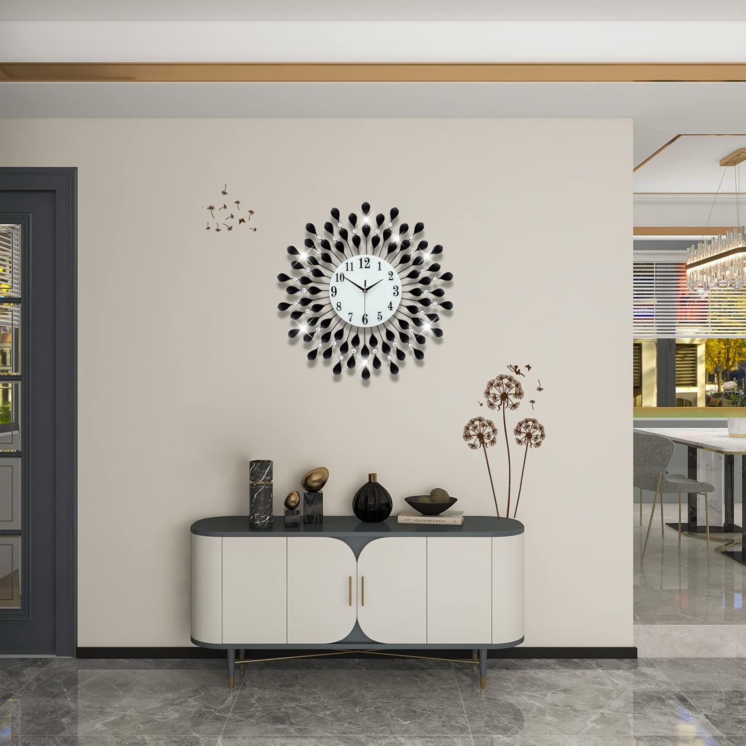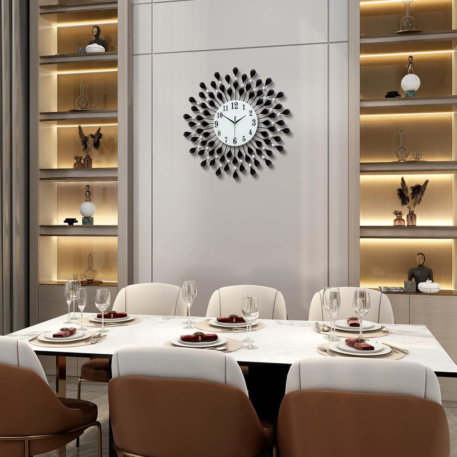 Enhance your interior with this stunning black crystal wall clock. Designed with elegant metal petals and sparkling crystals, it blends luxury and functionality. Perfect for living rooms, bedrooms, or offices. Features silent movement and durable build for long-lasting use.